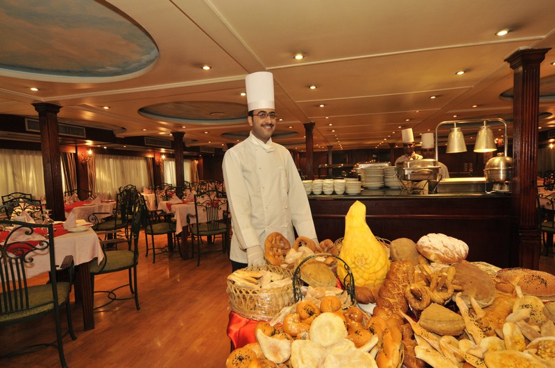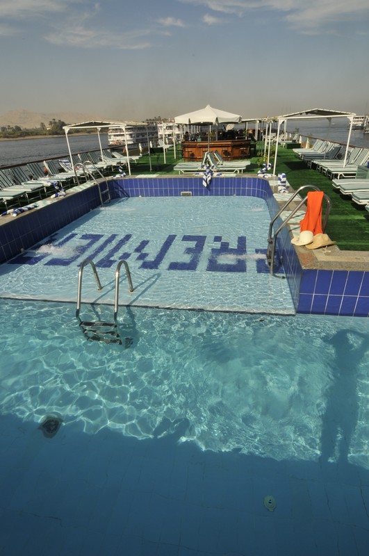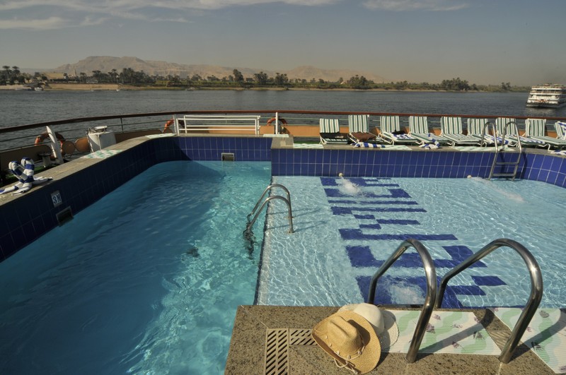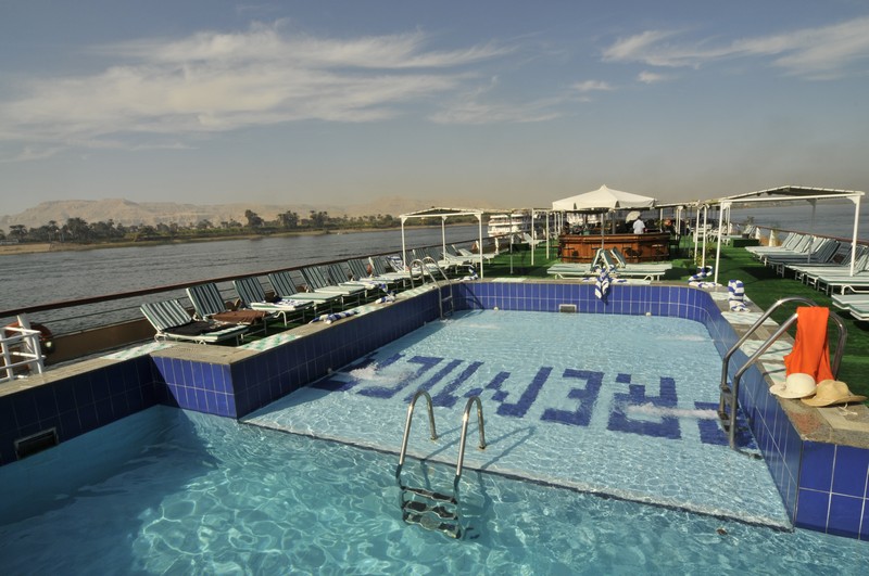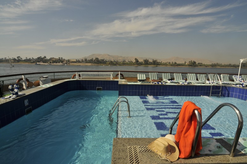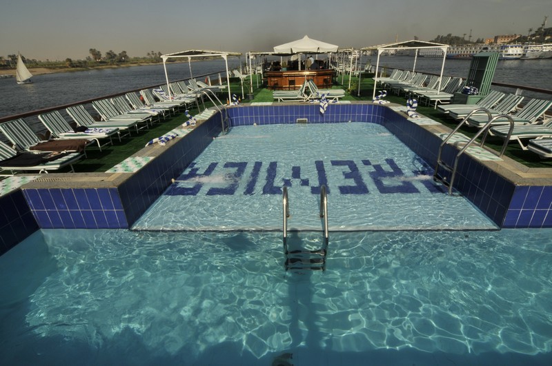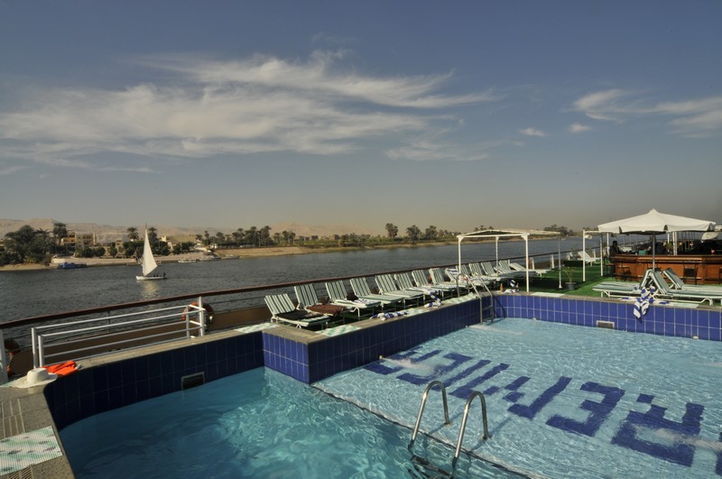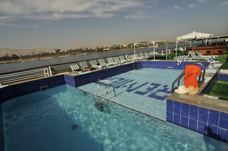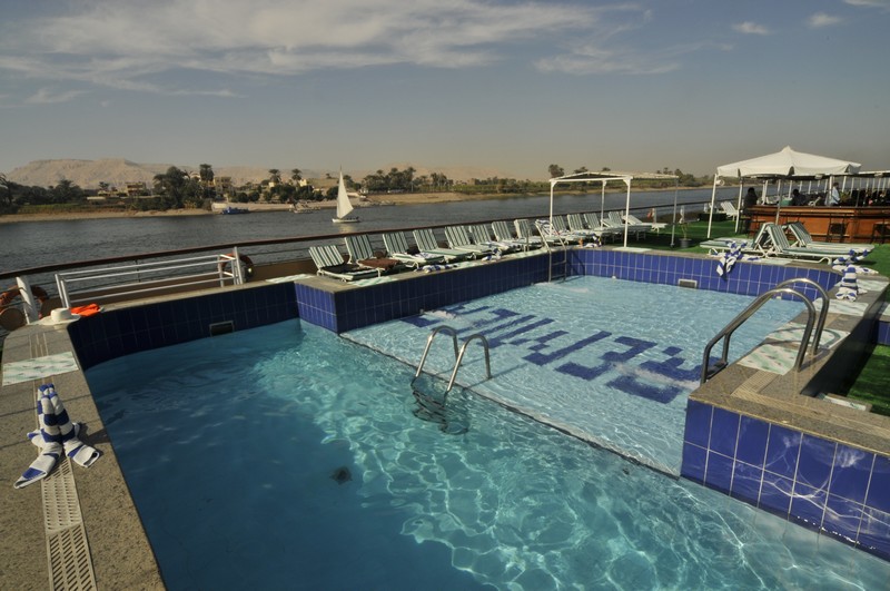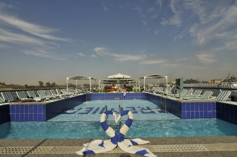 The spacious restaurant serving breakfast, lunch and dinner is situated on the middle deck. The lounge bar offering a range of drinks is a good place to sit and watch the nightly entertainment. The large sun deck located on the upper deck with its lovely wooden sun beds and stylish rattan furniture provides a relaxing place to sit and enjoy the spectacular views of the Nile. There is a swimming pool ideal for a refreshing dip during the day and a deck bar offering cool refreshments.